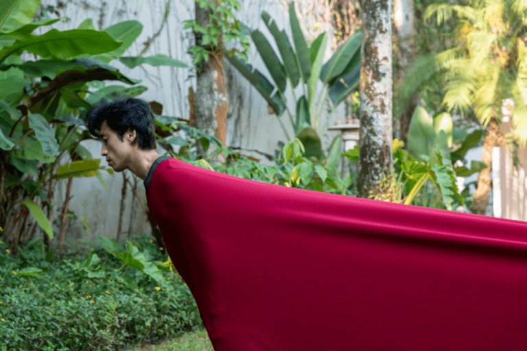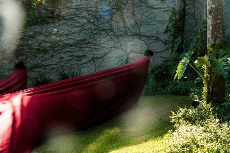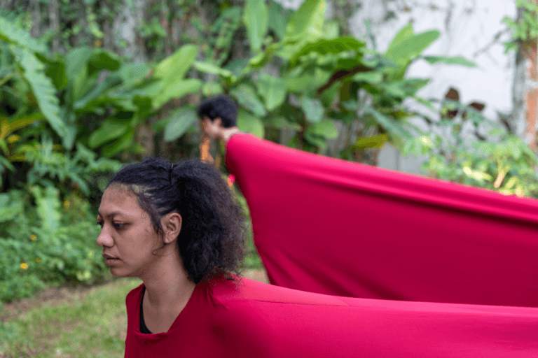 Com figurino de Valentina Soares, a performance explora a interdependência e a conectividade por meio de cinco corpos em contrapeso, unidos por um tecido vermelho, que criam desenhos dinâmicos, refletindo um “comum” construído por memórias fragmentadas. Inspirada no conceito japonês “Ma”, a ação utiliza o silêncio e o tempo suspenso como práticas de resistência e busca, por meio de um equilíbrio metaestável, composições visuais únicas, conectando ancestralidade e identidades.