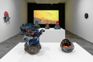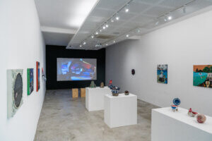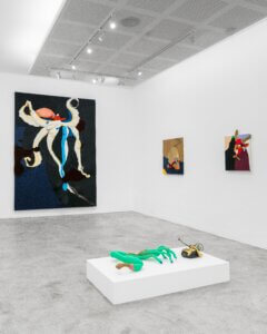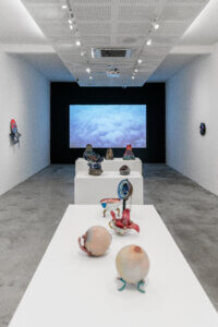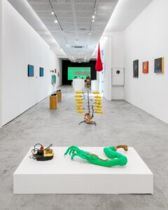 A mostra conta com filmes de Ivan Cardoso — o “mestre do terrir”, termo cunhado por ele nos anos 1970. O cineasta reúne referências contrastantes em colagens quadro a quadro que articulam a tropicália, o cinema expressionista alemão, Hélio Oiticica, Zé do Caixão, o cinema marginal brasileiro, o jornalismo sensacionalista e a poesia concreta, entre outros elementos, sem atribuir um sentido fixo aos diálogos criados. Darks Miranda incorpora as linguagens do cinema e da colagem em “Uma noite perigosa na ilha de Vulcano” (2022) , editado a partir de trechos de ficções científicas produzidas entre 1950 e 1980, auge da Guerra Fria. As pinturas de Flávia Metzler constroem cenas em fricção com a história da arte, utilizando fragmentos de imagens, objetos, arquitetura, e conceitos científicos ou filosóficos. Já Yuli Yamagata internaliza em suas peças referências do cinema de horror, das animações e das histórias em quadrinho japonesas, além da lógica dos ultraprocessados. Esse campo de interesse se concentra nas fórmulas de produção industrial de baixo custo (para as fábricas) e alto risco (para os consumidores), baseada em aditivos químicos, estabelecendo assim, uma espécie de “realidade transgênica”.